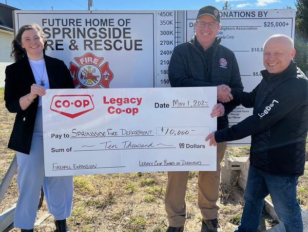 The Town of Springside would like to share our immense appreciation to the Legacy Co-Op. Earlier this spring, Legacy Co-Op was in our community to delivery a cheque for $10,000 to the Springside Fire Department for the Fire Hall Expansion Project.
