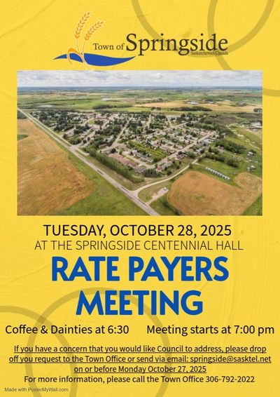 The Springside Town Council is hosting a Rate Payers meeting on Tuesday, October 28, 2025. Please see attached flyer for details. Residents are encouraged to submit all questions in writing to the Springside Town Office no later than Monday, October 27, 2025. Question request forms are available at the Town Office as well as Peggy’s Canteen located in the Ridge Runner Arena.