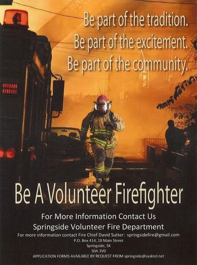 Interested in helping the community by being a volunteer firefighter? For information, contact Fire Chief Dave Sutter at springsidefire@gmail.com, or pick up an application form at the Town Office.